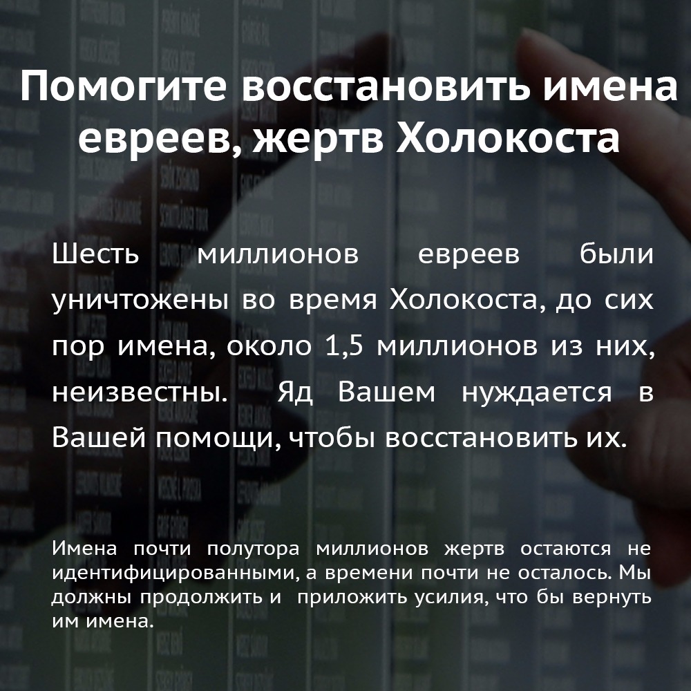 Имена примерно 1,5 миллиона жертв Холокоста все еще остаются неизвестными. Заполните простую форму https://goo.gl/EBnTuU и помогите вернуть вечную память жертве Холокоста.